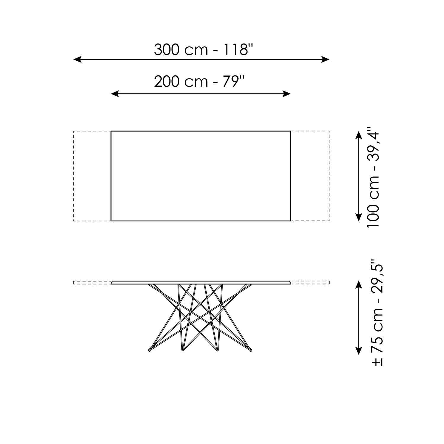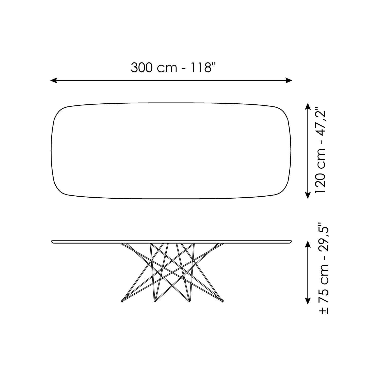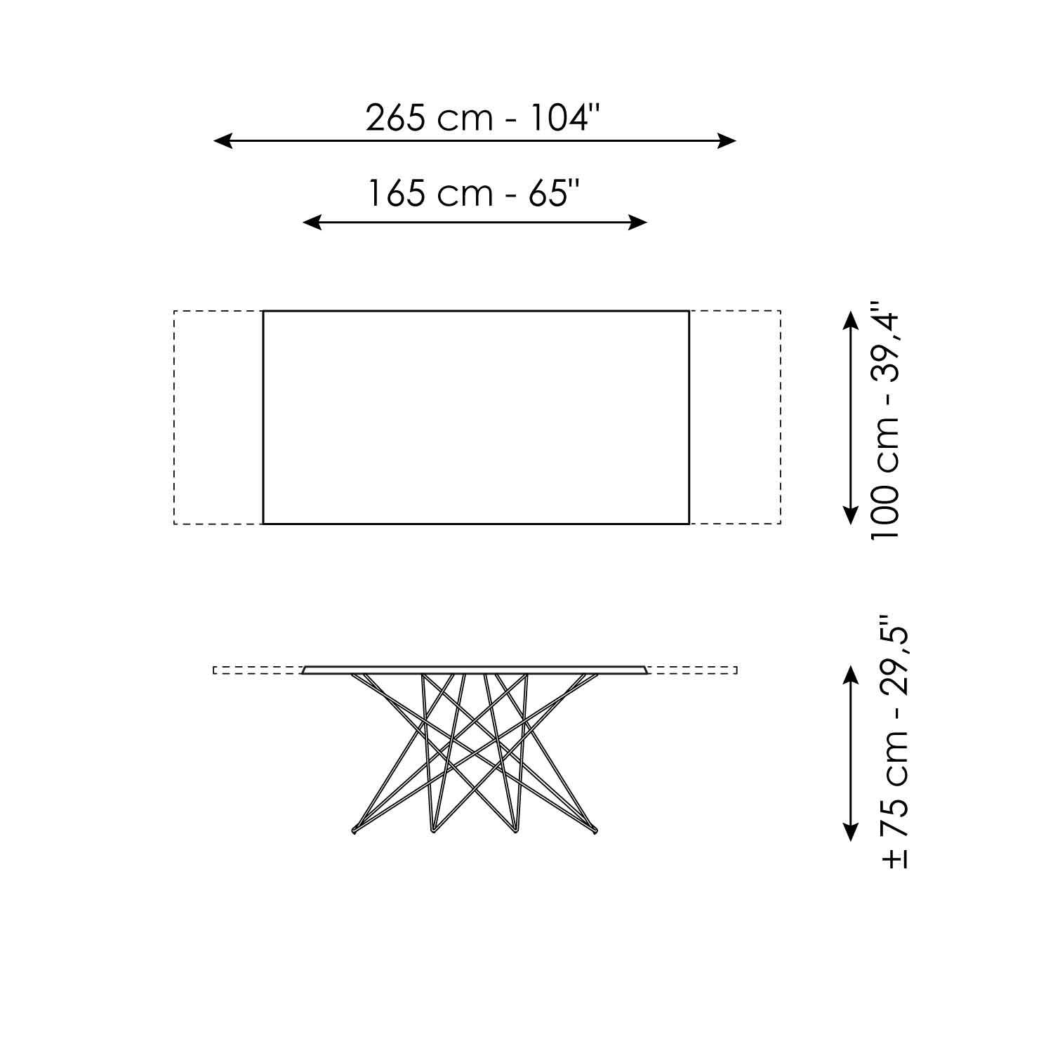 Die Platte kann fest oder ausziehbar sein, sie ist in zahlreichen Materialien und Ausführungen erhältlich; in der runden Version ist die Platte fest und wird aus Kristall oder Keramik hergestellt. Bei den feststehenden rechteckigen und tonnenförmigen Varianten gibt es auch Ausführungen in Holzfurnier und Massivholz für die Platte. Ihr Bild ist im Kontrast zur Basis schlicht und linear. Das Gesamtergebnis ist ein fast molekulares Gleichgewicht für einen entschieden ungewöhnlichen und eleganten Tisch, der fähig ist, den Raum mit einer Andeutung von Gesuchtheit und Modernität zu charakterisieren: diejenige eines Symbols, das ein Objekt wird.