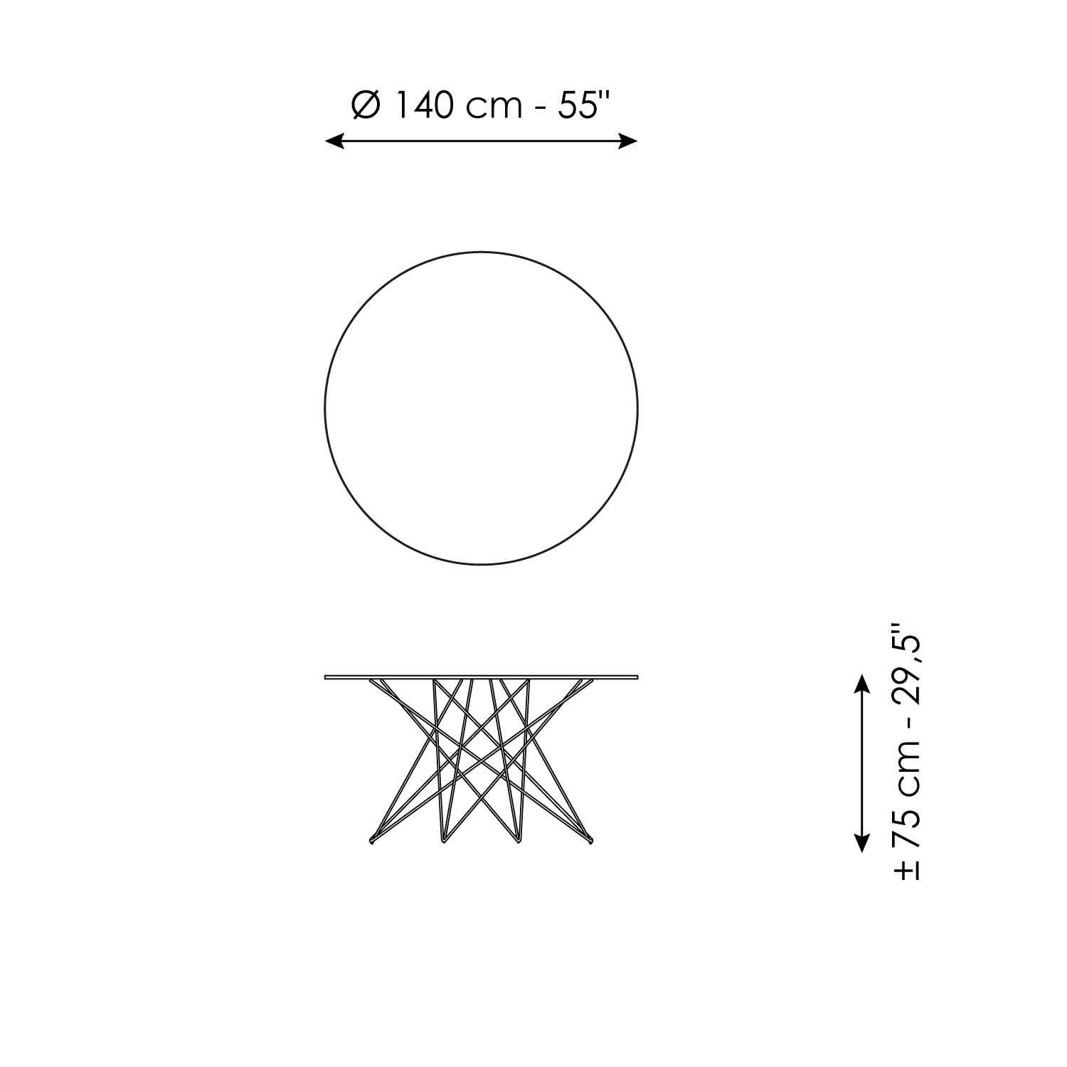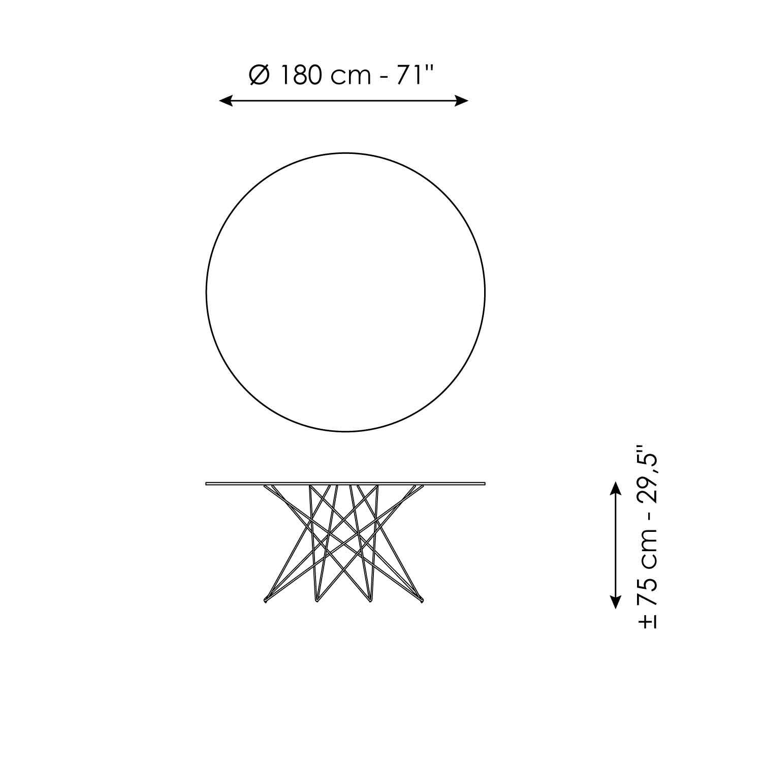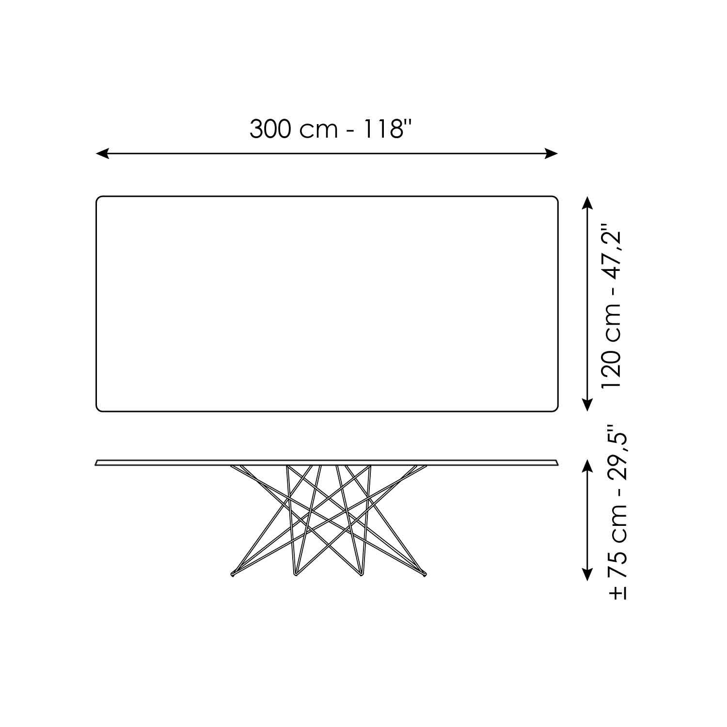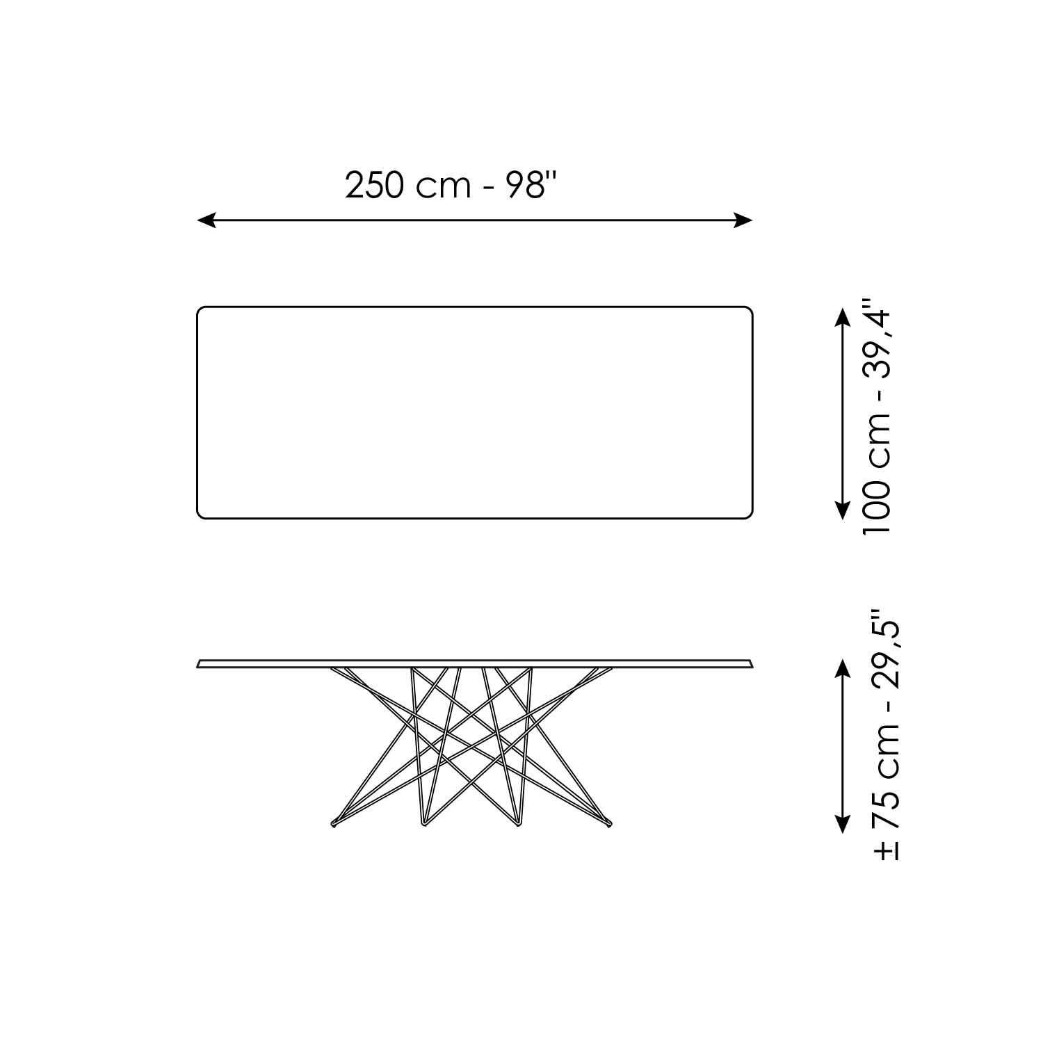 Die Platte kann fest oder ausziehbar sein, sie ist in zahlreichen Materialien und Ausführungen erhältlich; in der runden Version ist die Platte fest und wird aus Kristall oder Keramik hergestellt. Bei den feststehenden rechteckigen und tonnenförmigen Varianten gibt es auch Ausführungen in Holzfurnier und Massivholz für die Platte. Ihr Bild ist im Kontrast zur Basis schlicht und linear. Das Gesamtergebnis ist ein fast molekulares Gleichgewicht für einen entschieden ungewöhnlichen und eleganten Tisch, der fähig ist, den Raum mit einer Andeutung von Gesuchtheit und Modernität zu charakterisieren: diejenige eines Symbols, das ein Objekt wird.