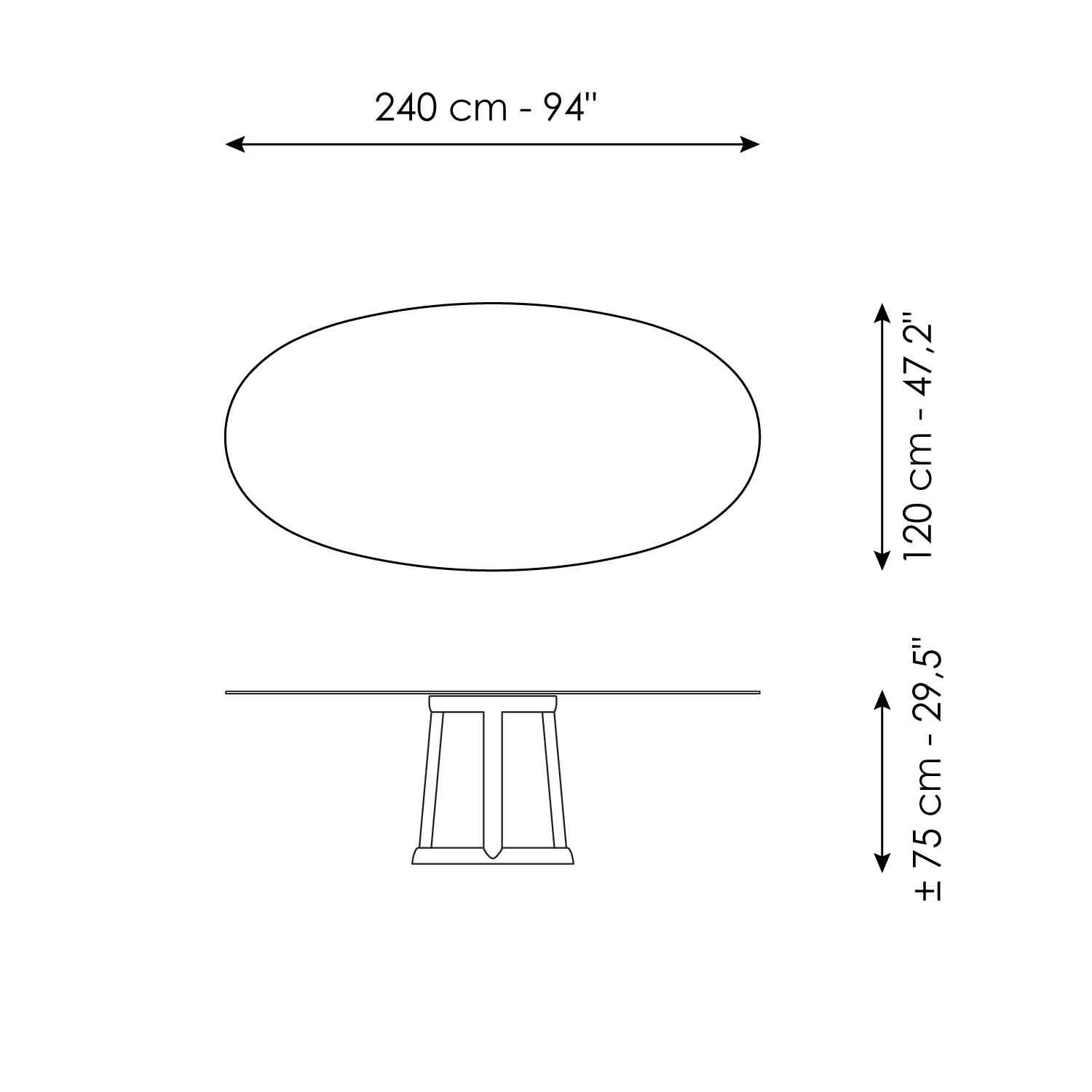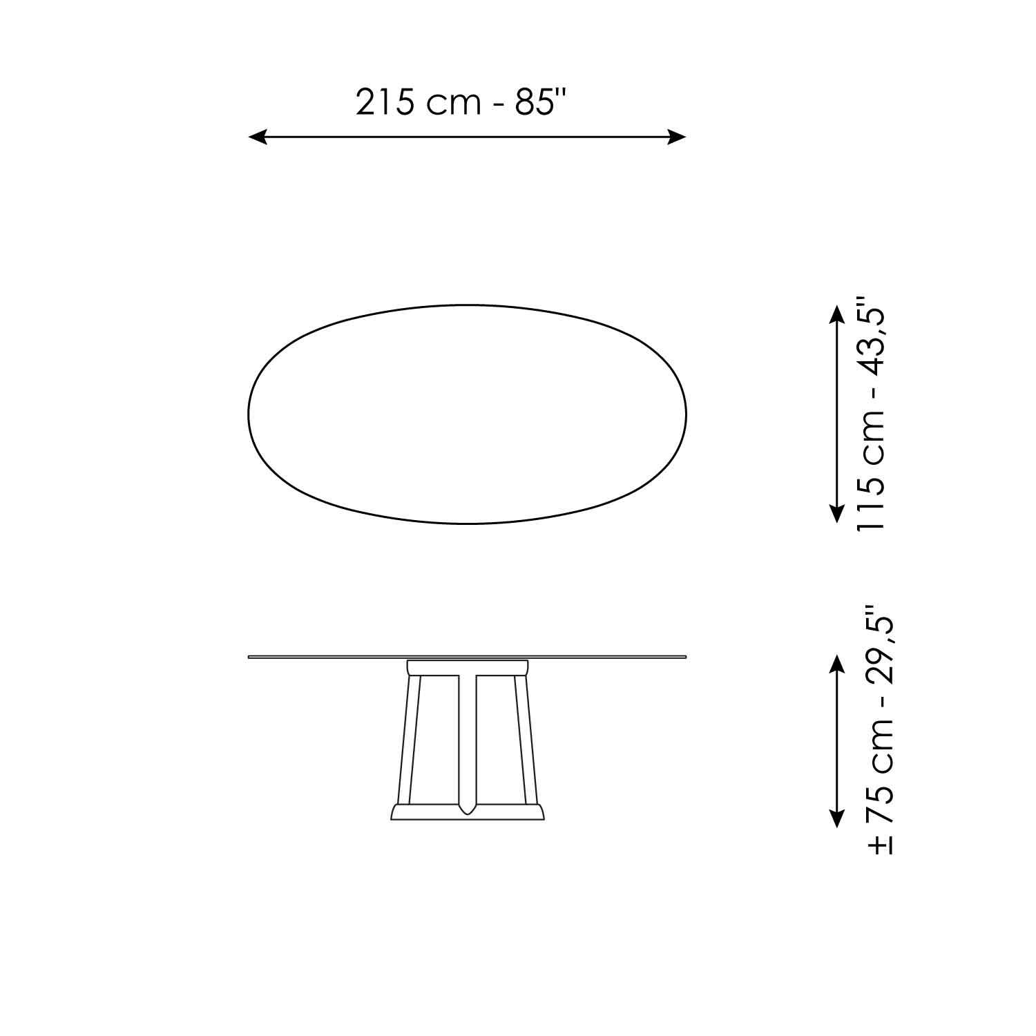 Marked by harmonious elegance, this fixed table combines a solid wooden base, available in two different finishes (American walnut and coal ash), with an oval or round top made with different finishes in marble, glass or ceramic.