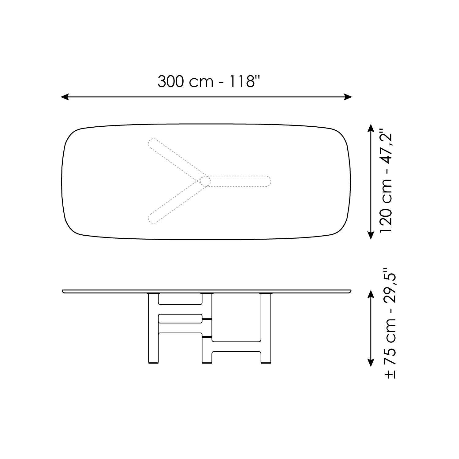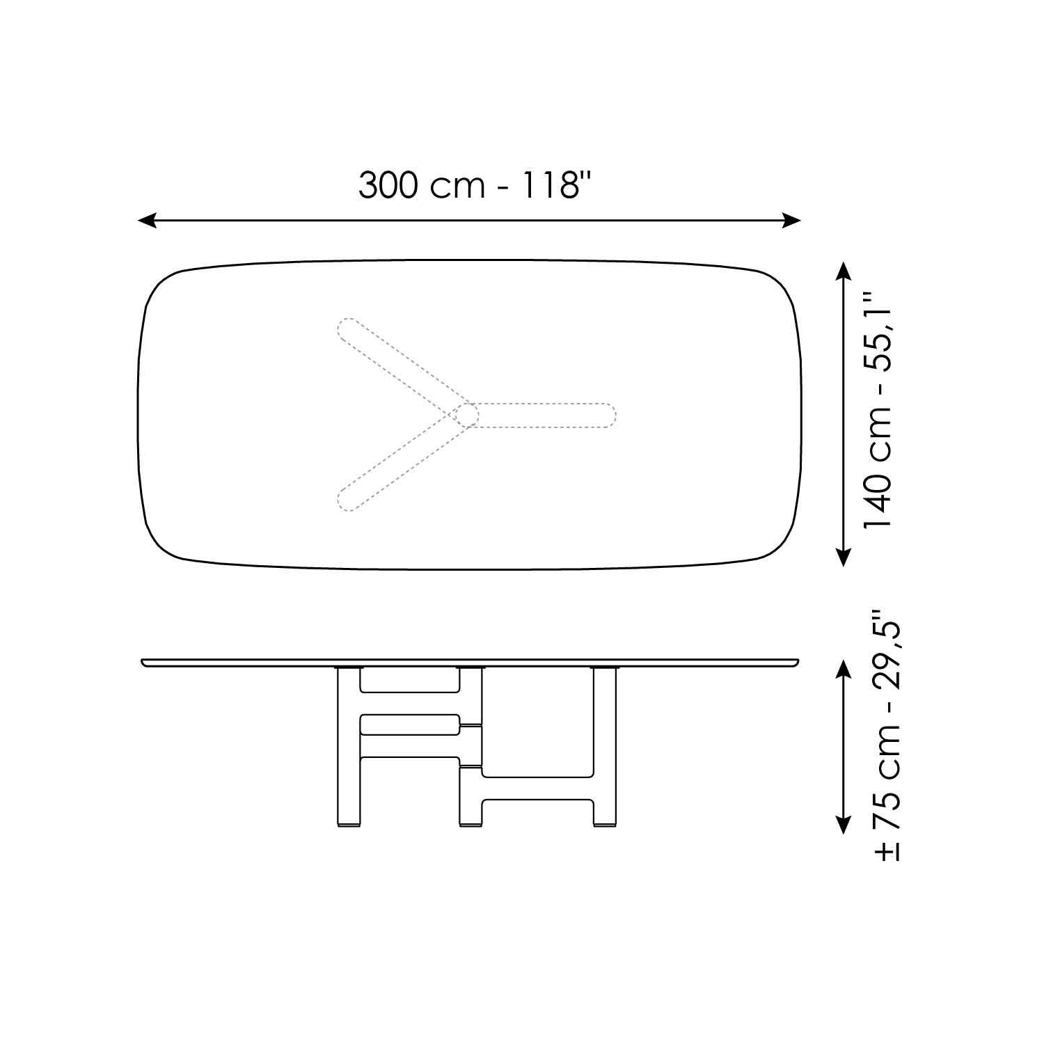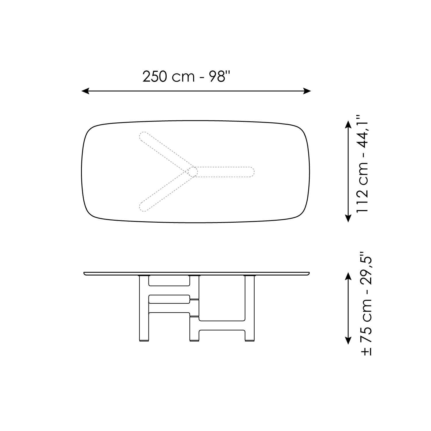 In this crossed leg dining table, the legs are made of coal oak or solid walnut wood with metal inserts, while the top is available in marble, solid wood, glass and ceramic in the two round and round-edged versions.