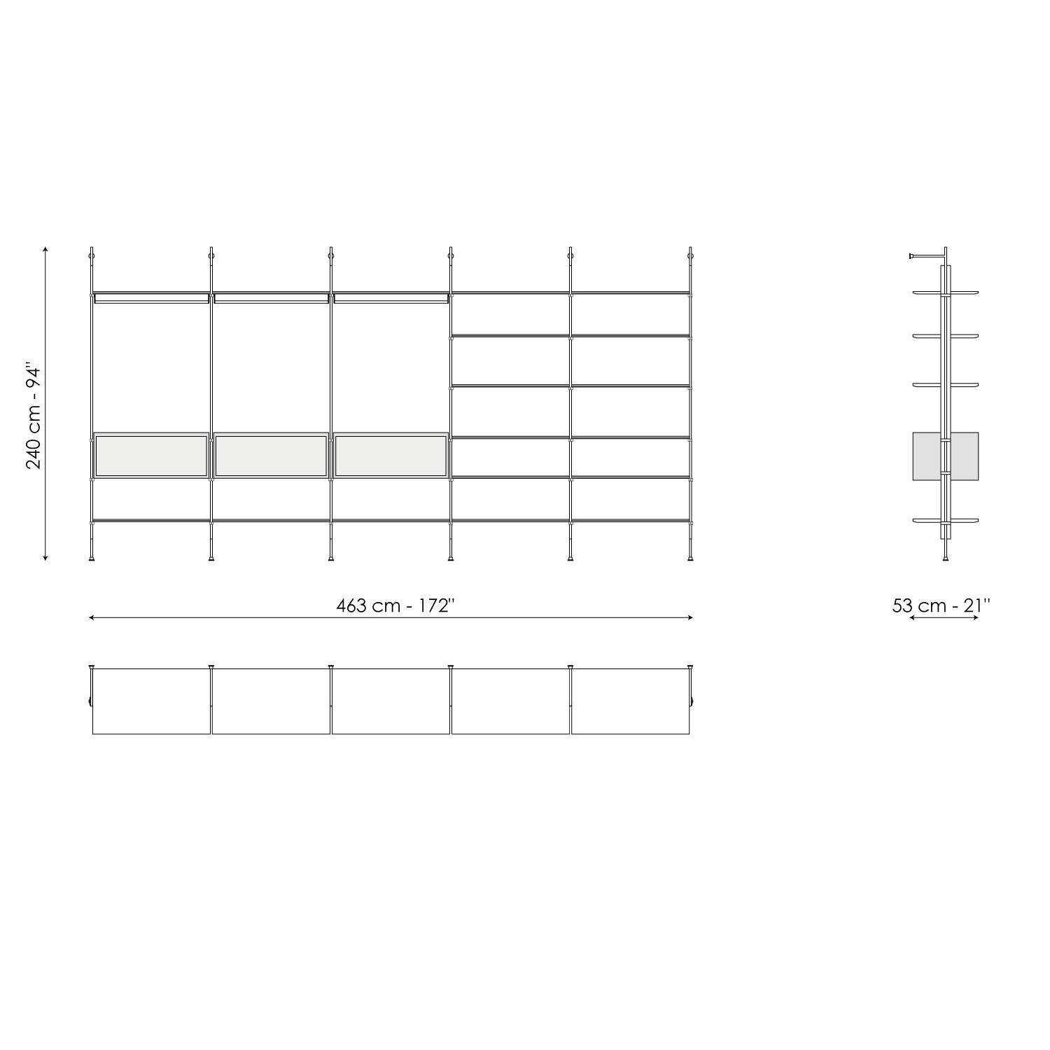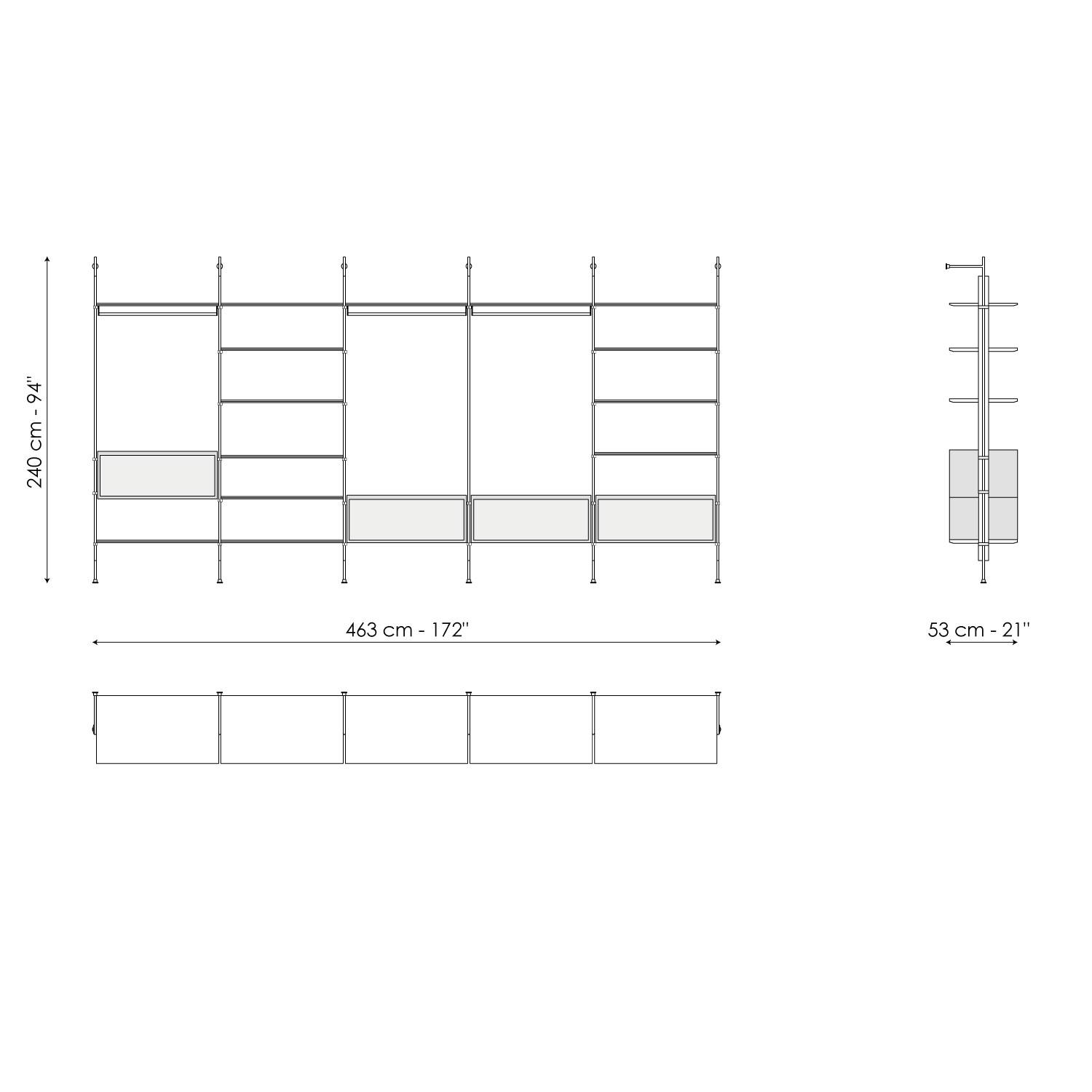 The Roll walk-in closet is inspired by the bookcase with the same name designed by Dondoli and Pocci. It is a functional piece of furniture with a striking theatrical effect, designed with proportions, sizes and accessories suitable for the walk-in cupboard function. It is completely open, designed for linear solutions with wall fixings: its frame is in lead while the shelves are available in lead-coloured painted wood or Canaletto walnut to obtain an elegant contrast. Wooden containers and space-saving storage boxes can be positioned according to needs.