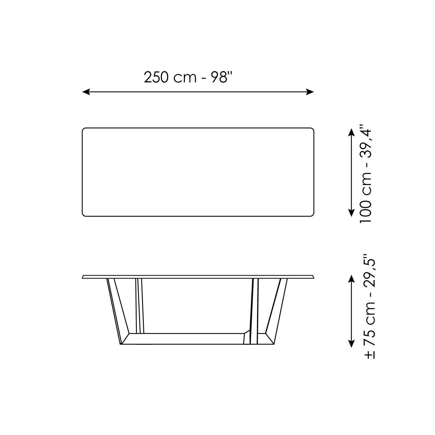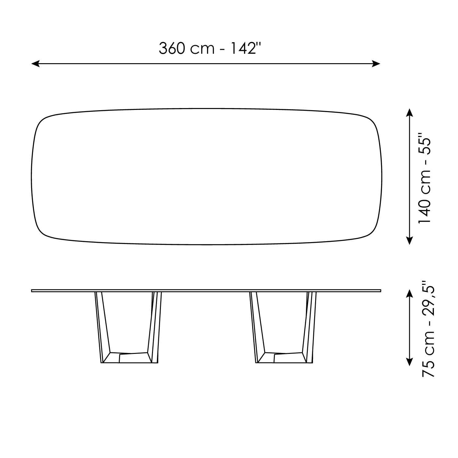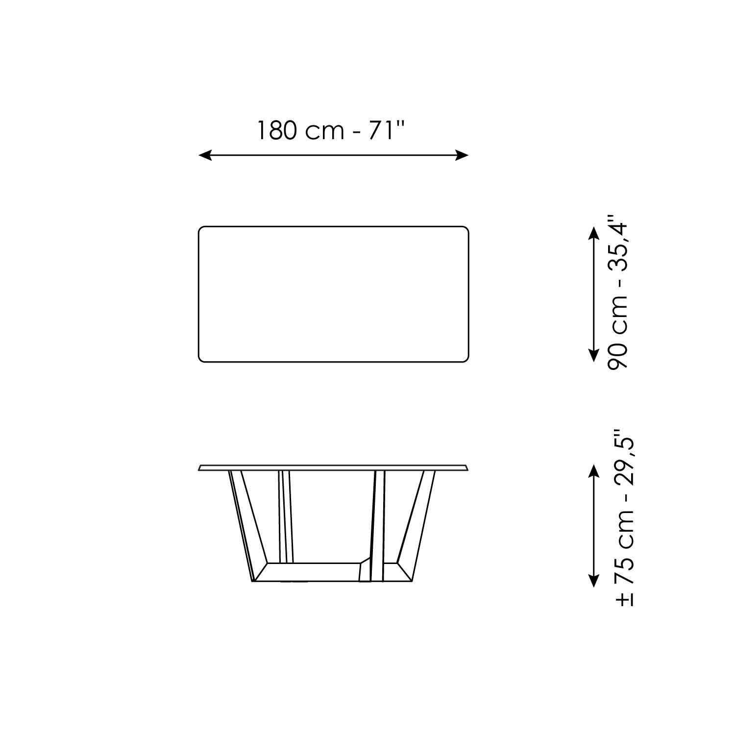 La base de la mesa Art es el elemento que más la caracteriza: consiste en un trapecio de metal que se desarrolla diagonalmente con respecto al tablero y permite aprovechar los espacios de la mejor manera.