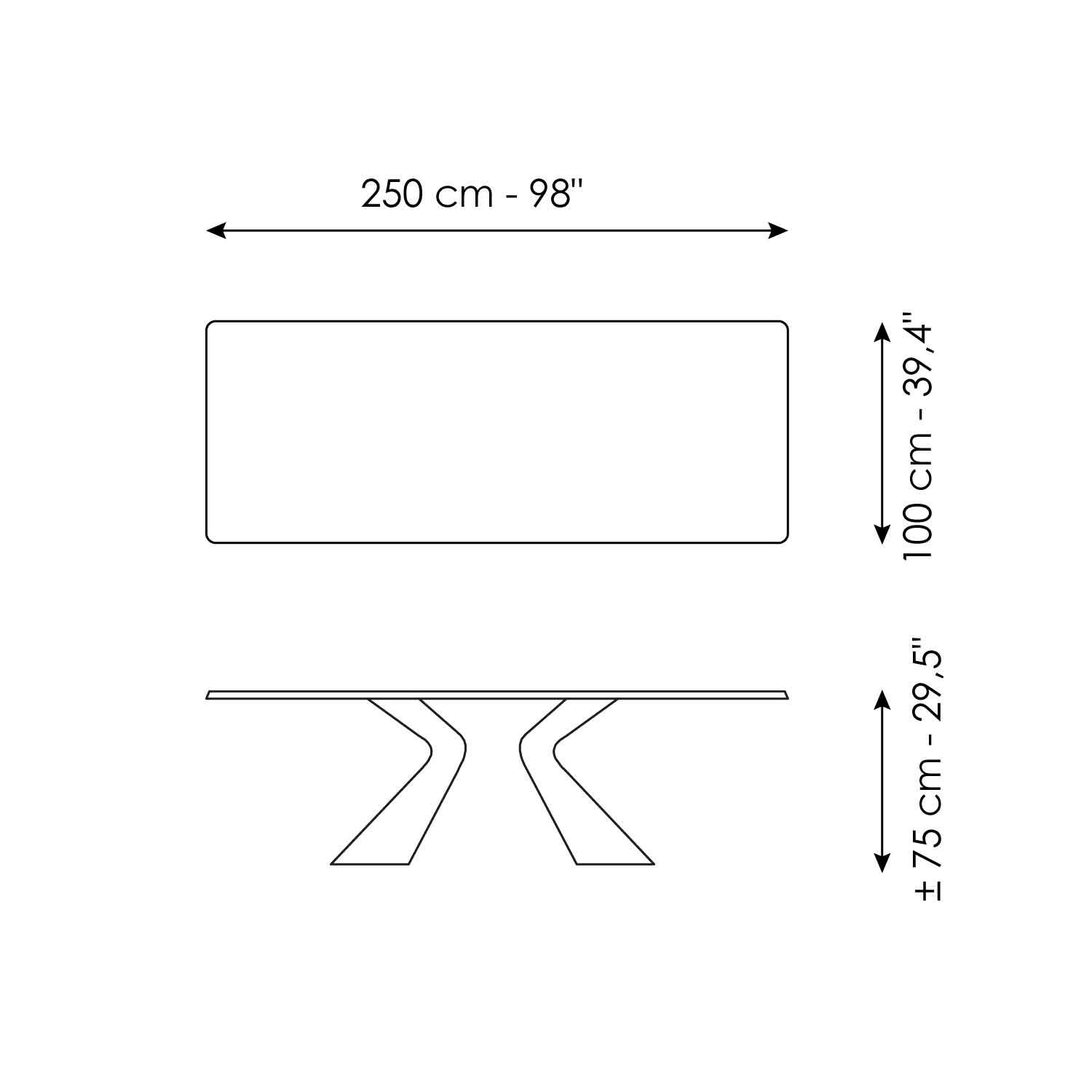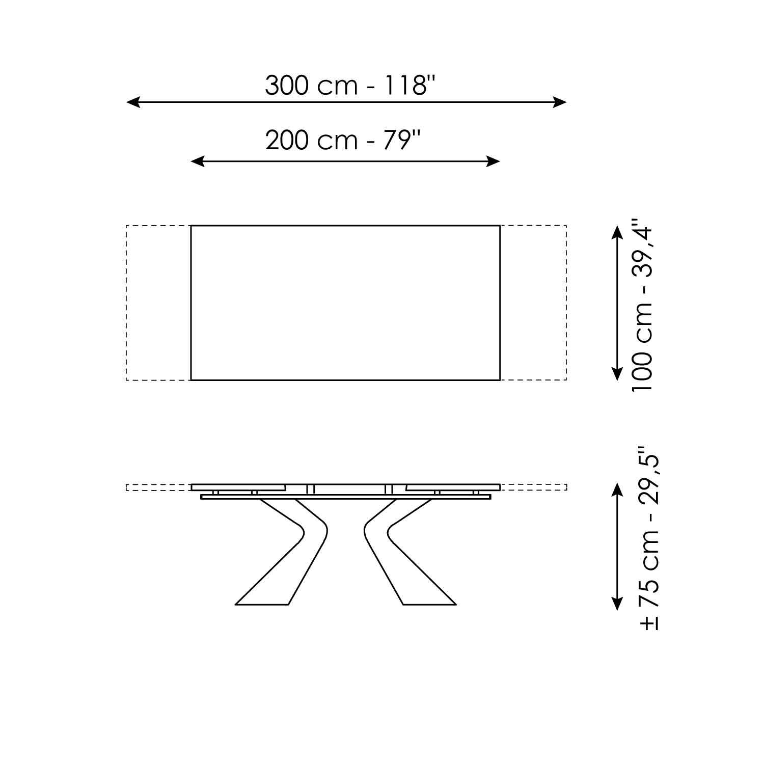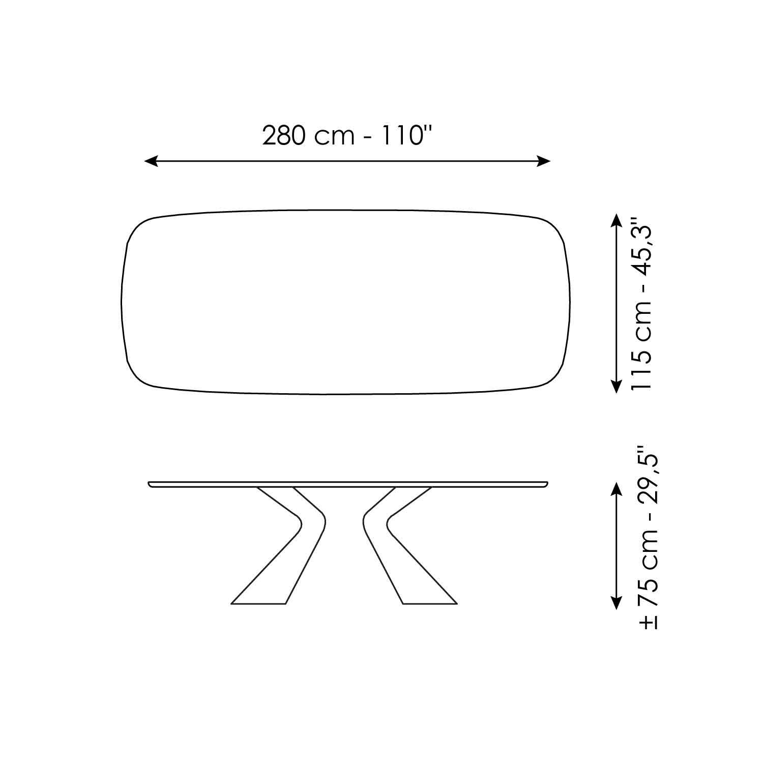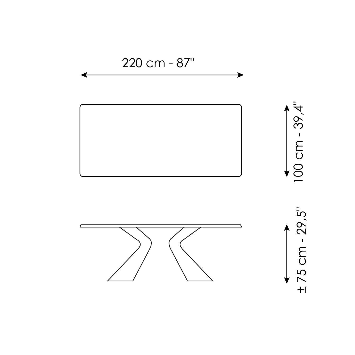 Il profilo possente e inclinato del basamento, che ricorda la prua di una nave, crea una presenza dinamica e plastica che diventa protagonista degli ambienti, arredando e ottimizzando al tempo stesso lo spazio di seduta. La molteplicità di finiture disponibili per la base e il piano consente una piena possibilità di personalizzazione senza compromettere la purezza del progetto e anzi amplificando la valenza artistica. Il piano è realizzato in diverse dimensioni ed è proposto nella versione fissa o allungabile. In quest'ultima variante diventa un tavolo allungabile di design dove le due prolunghe laterali indipendenti permettono di aumentare con facilità la lunghezza d’appoggio, mantenendo un’ottima stabilità e solidità senza rinunciare a un'estetica pulita e ricercata.