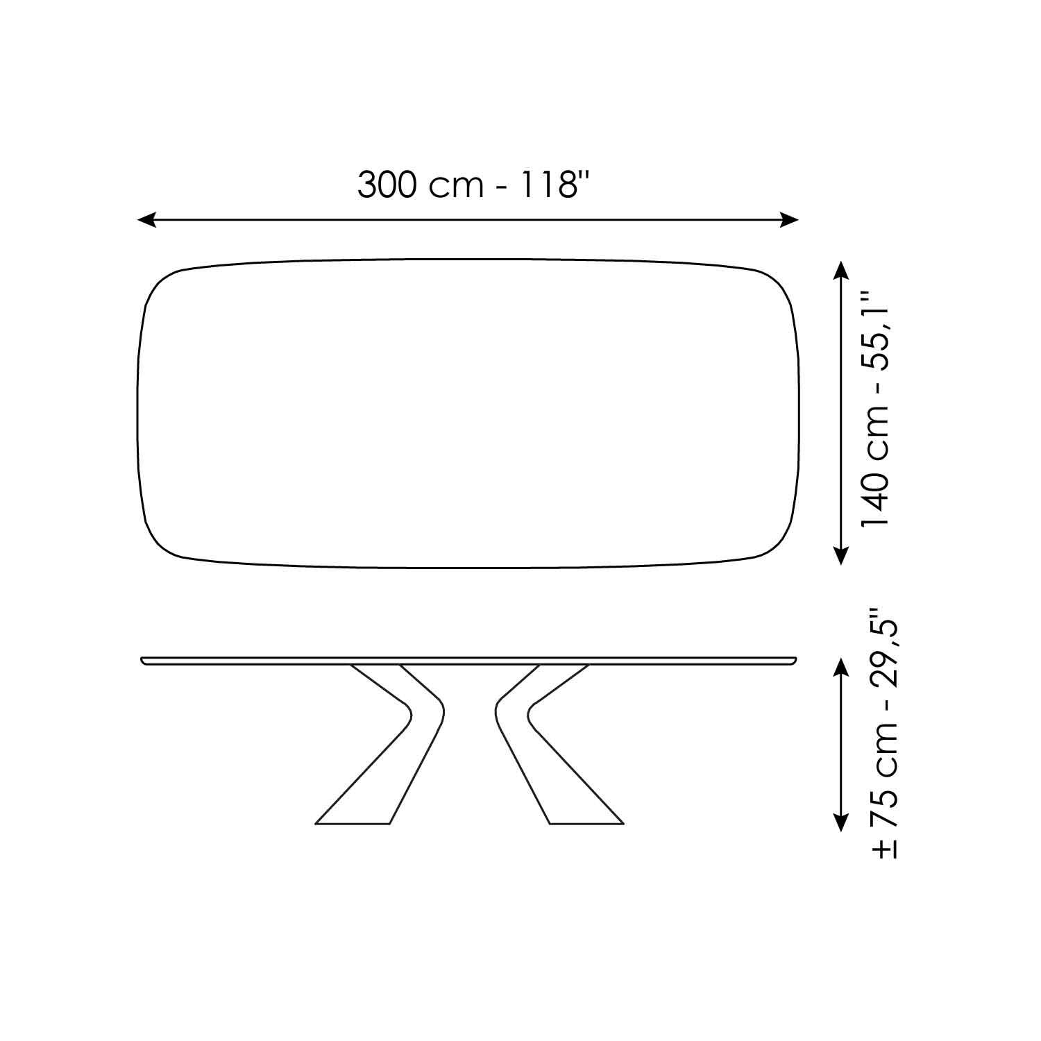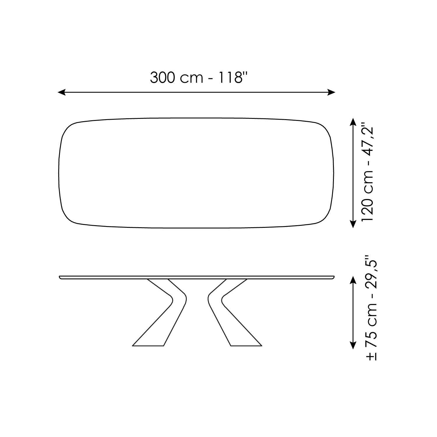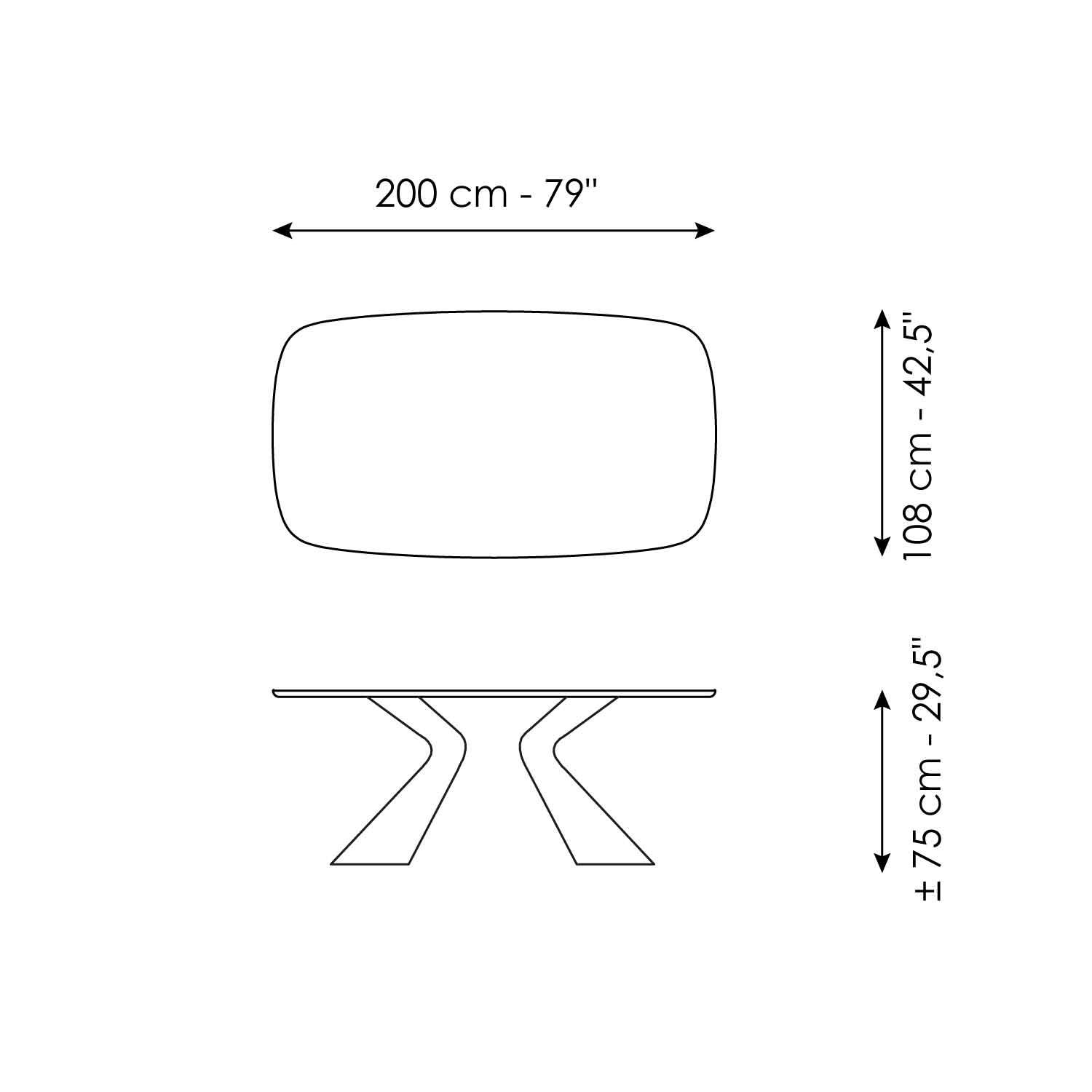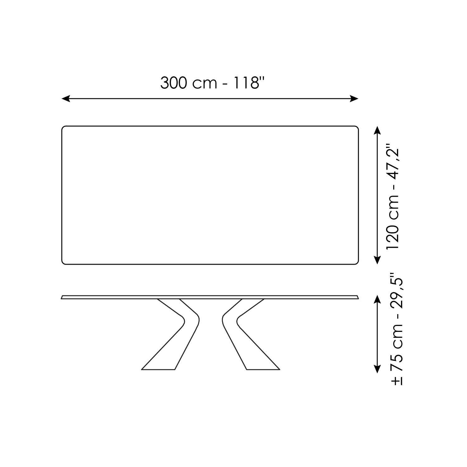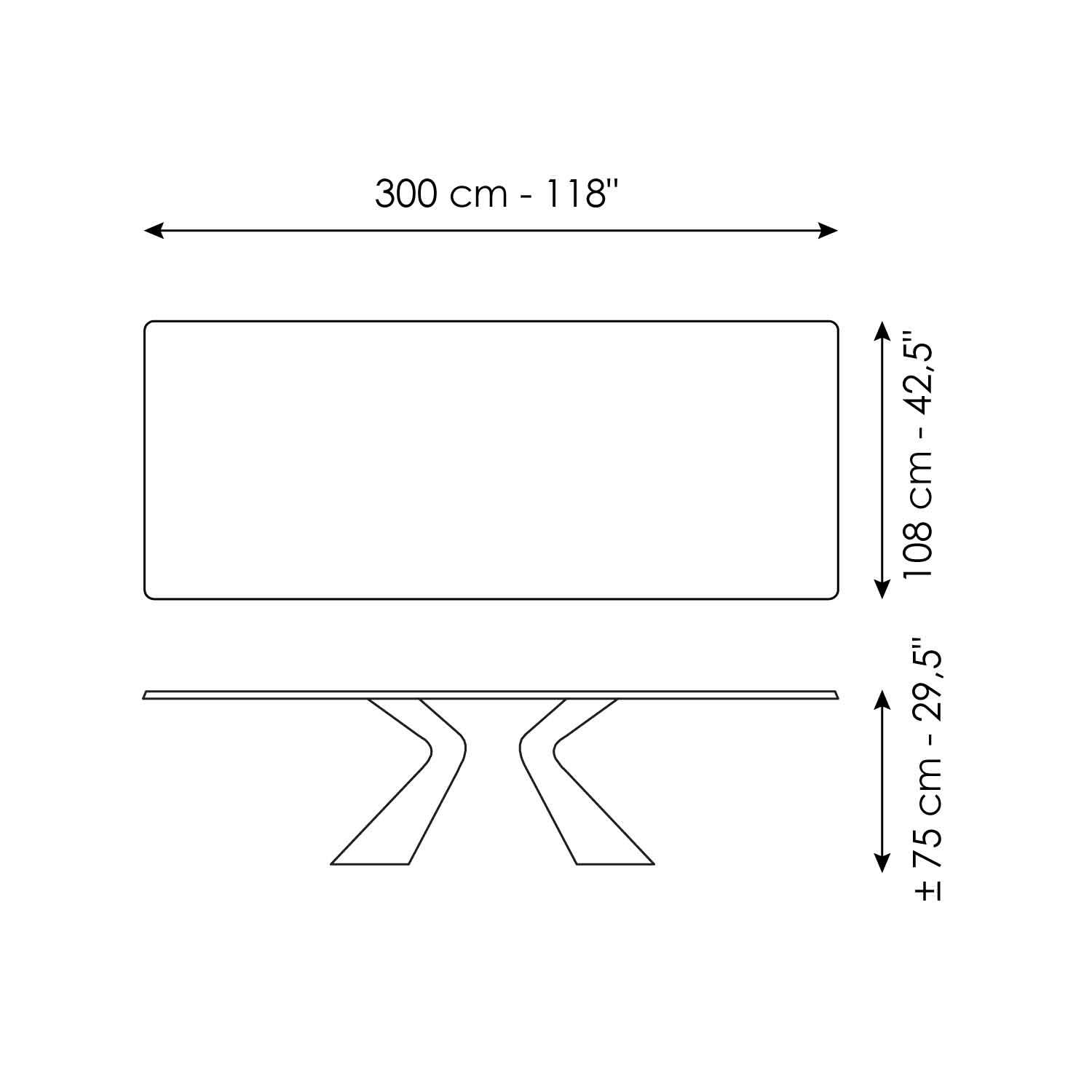 Il profilo possente e inclinato del basamento, che ricorda la prua di una nave, crea una presenza dinamica e plastica che diventa protagonista degli ambienti, arredando e ottimizzando al tempo stesso lo spazio di seduta. La molteplicità di finiture disponibili per la base e il piano consente una piena possibilità di personalizzazione senza compromettere la purezza del progetto e anzi amplificando la valenza artistica. Il piano è realizzato in diverse dimensioni ed è proposto nella versione fissa o allungabile. In quest'ultima variante diventa un tavolo allungabile di design dove le due prolunghe laterali indipendenti permettono di aumentare con facilità la lunghezza d’appoggio, mantenendo un’ottima stabilità e solidità senza rinunciare a un'estetica pulita e ricercata.