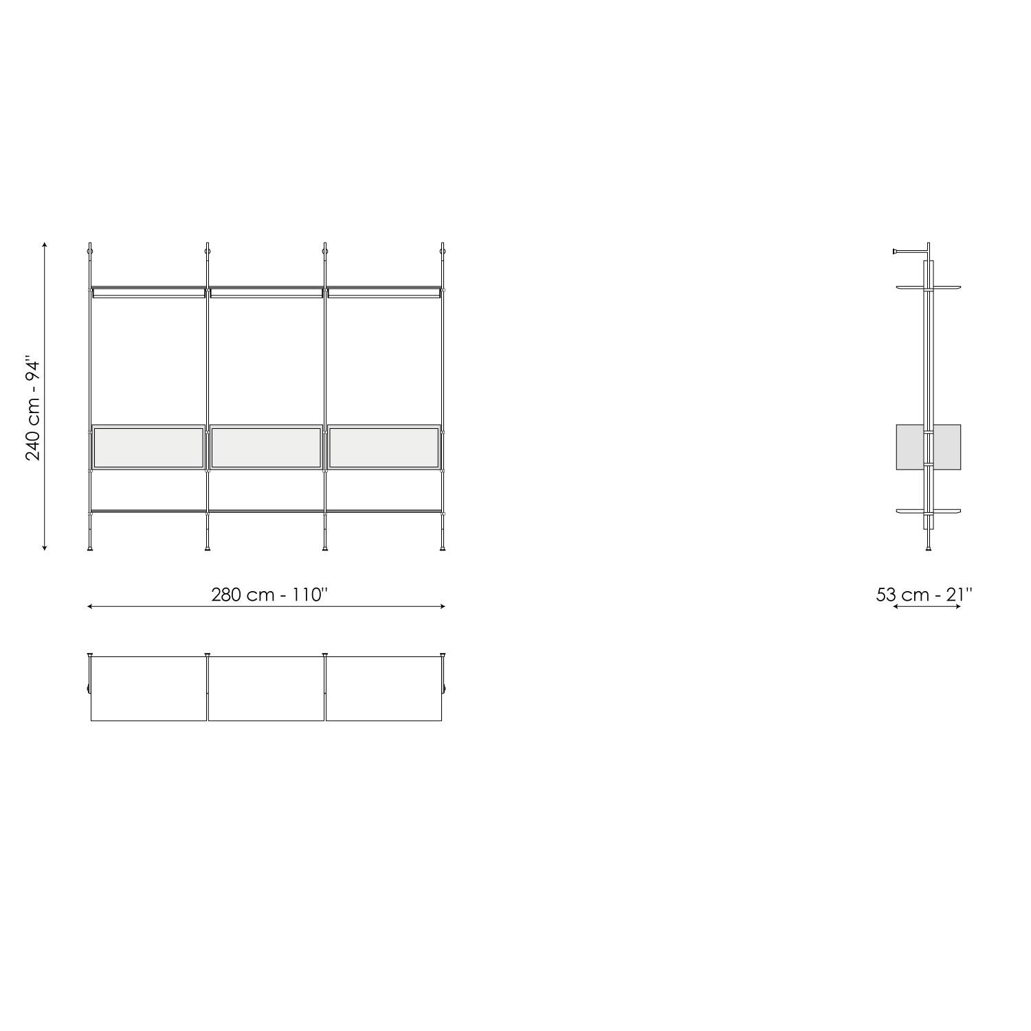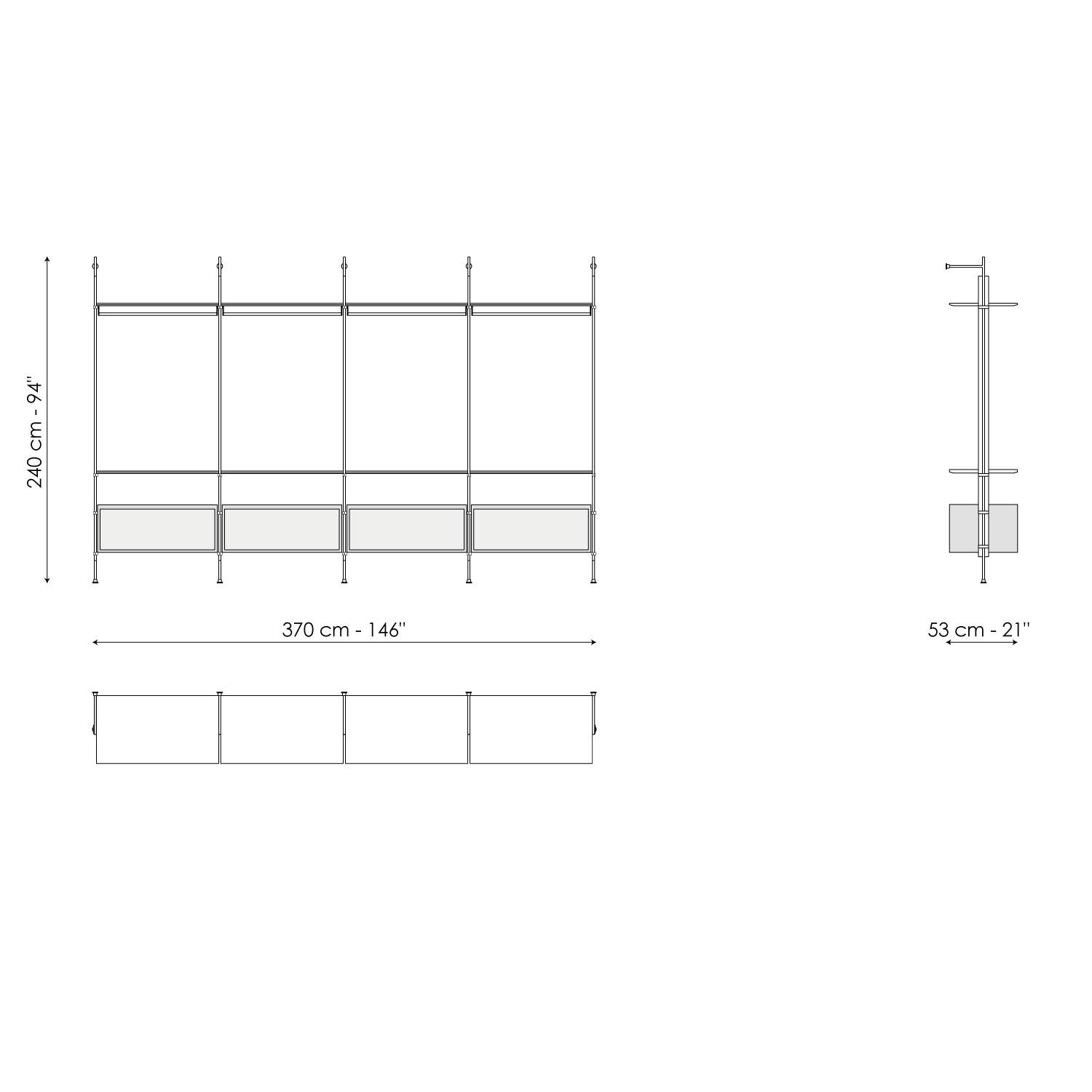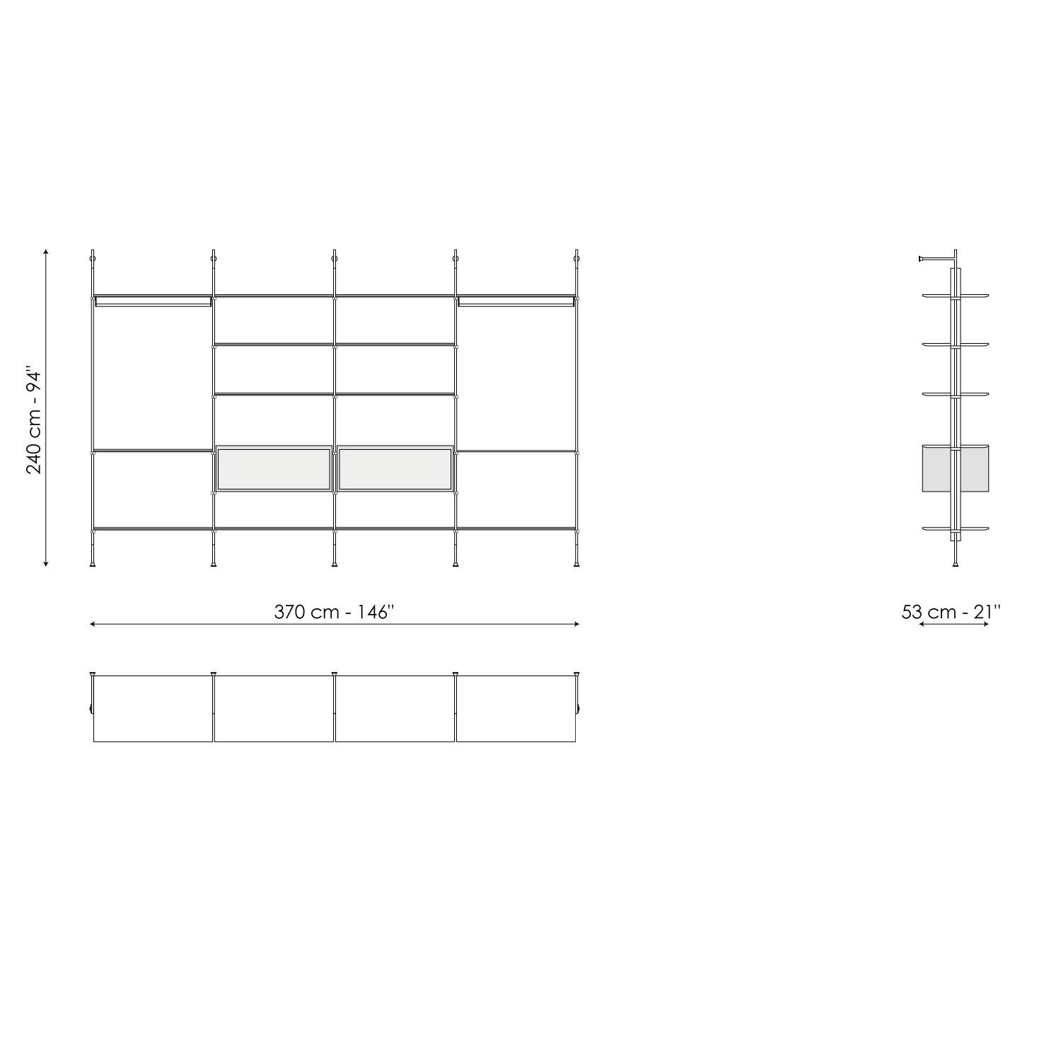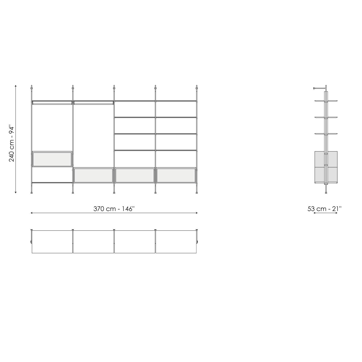 The Roll walk-in closet is inspired by the bookcase with the same name designed by Dondoli and Pocci. It is a functional piece of furniture with a striking theatrical effect, designed with proportions, sizes and accessories suitable for the walk-in cupboard function. It is completely open, designed for linear solutions with wall fixings: its frame is in lead while the shelves are available in lead-coloured painted wood or Canaletto walnut to obtain an elegant contrast. Wooden containers and space-saving storage boxes can be positioned according to needs.