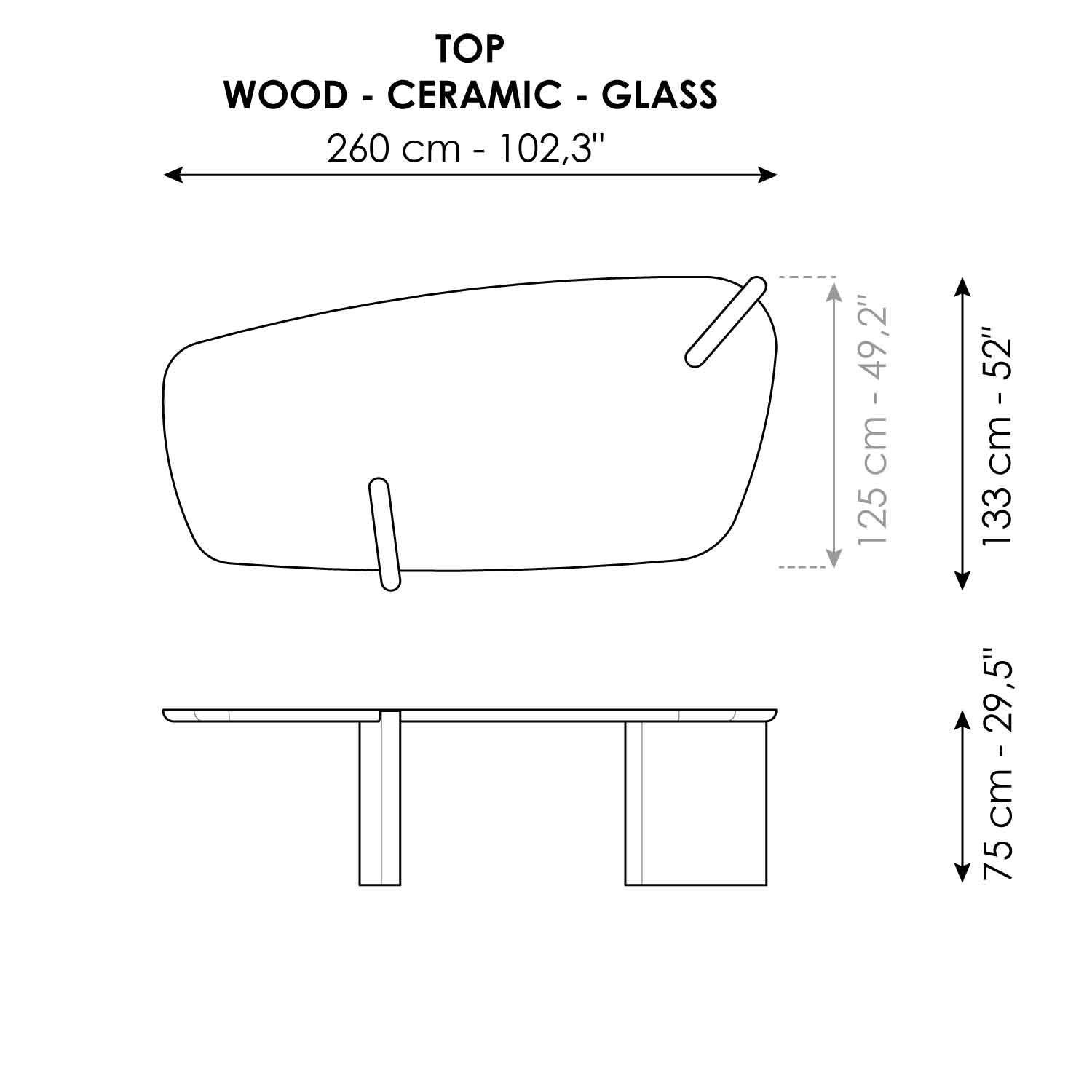 To meet different design needs, the Flatiron table is available in different versions: Mono or Double Material. The Mono Material version, with a wooden top and base for a highly harmonious overall vision, is available in either trapezoidal or round shapes. The Double Material version features a marble base that elegantly matches the wooden top, or a top in either glass or ceramic resting on a wooden base. A further option is the Free Combination, which allows for a free combination of different essences of wood for the top and lacquered wooden base in lead and bronze tones.